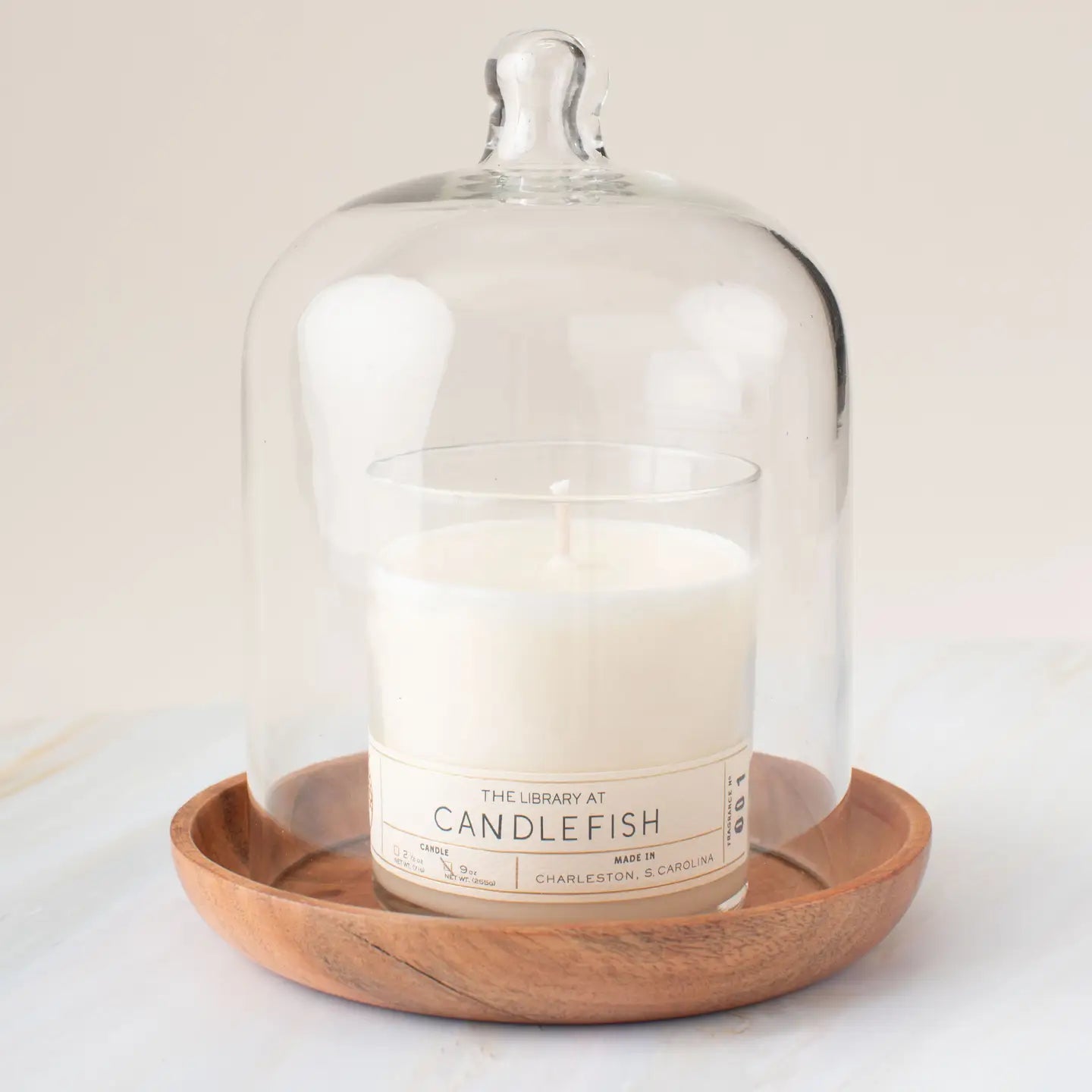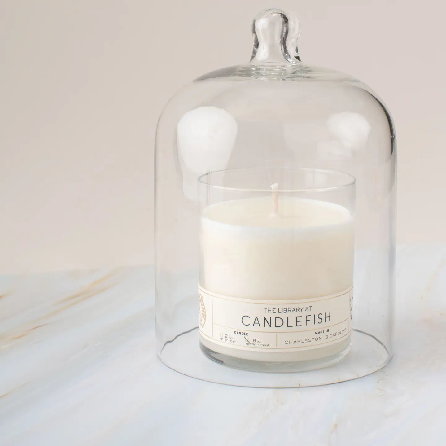 Display Tips: - glass dome fits our Candlefish 9 ounce jar and others in the collection - use as an artful part of your Candlefish display - candle fragrance will be captured inside the dome for optimum scent experience - adds an elegant look to a candle display in shop AND at home - measures 7" height x 4.75" diameter
